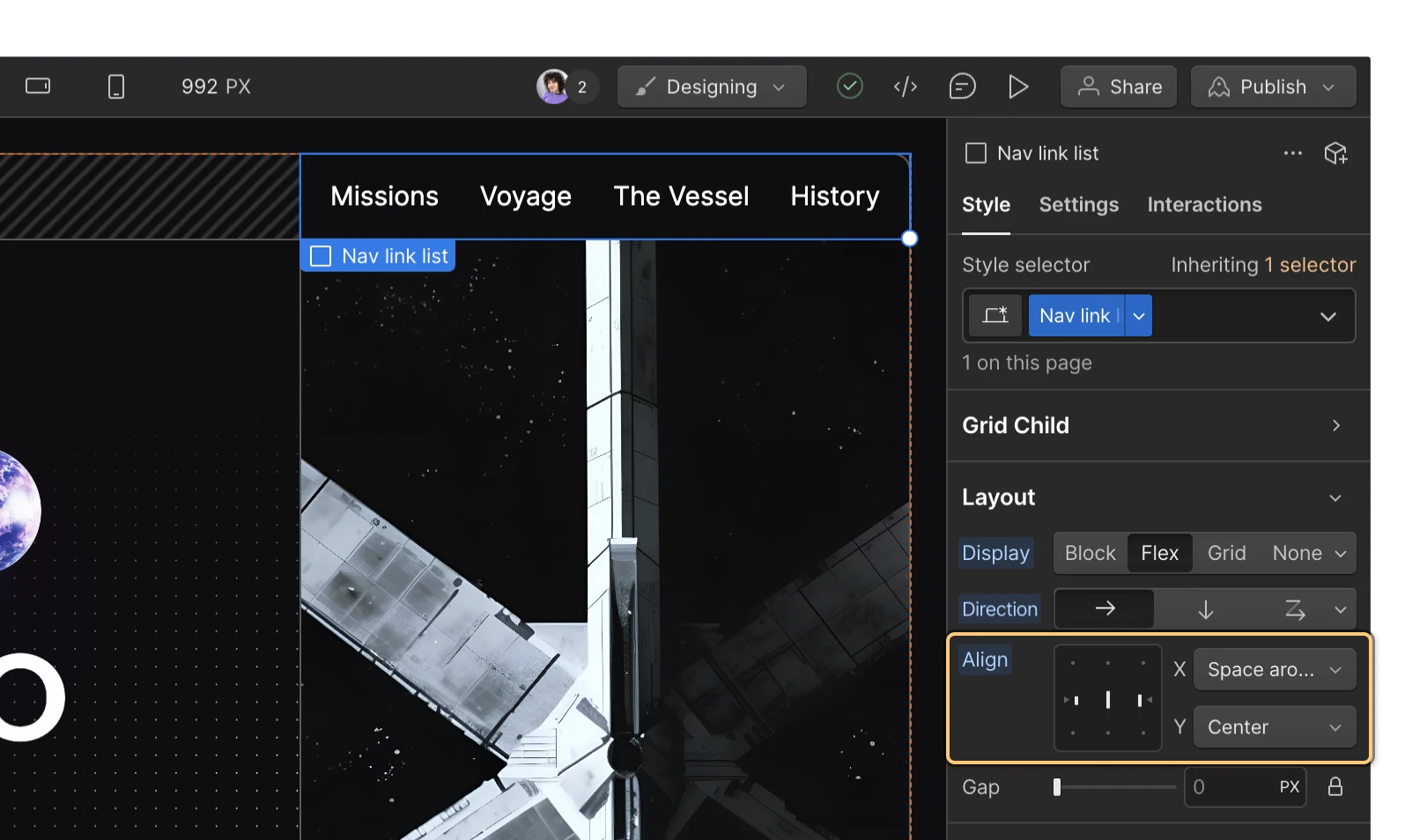 The align box is a 3 x 3 grid that appears in Style panel > Layout when display is set to flex or grid. You can use the align box as a visual representation of the flex parent or grid to quickly align flex and grid children inside their parent elements.